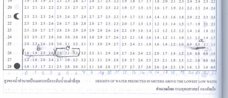 b คือช่วงเวลา เที่ยงคืนไปจนถึงตีสามคือช่องเวลาที่ไต๋กับนักตกปลาต้องจอดเรือนอนพักผ่อนเอาแรง ( โดยต้องไม่ลืมคุยกับไต๋ให้นำเรือไปทิ้งสมอใกล้ๆกับหมายจ้าบๆของแก) เนื่องจากช่วงนี้น้ำจะเดินแรงมาก โดยในตารางน้ำระบุว่าน้ำมีการเปลี่ยนแปลง 3 m/hour นั่งตกไปก็ไม่ค่อยมีปลามาฉวย เปลืองเหยื่อเปล่าๆ