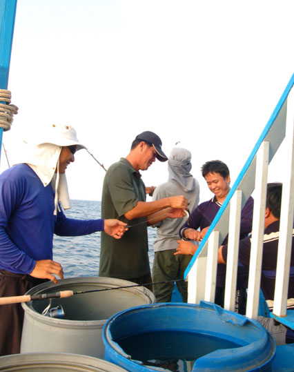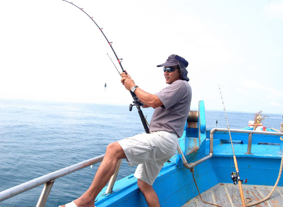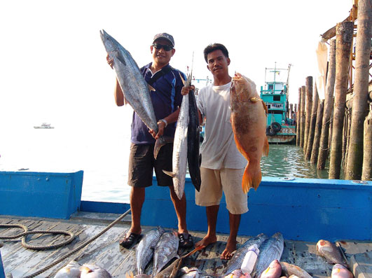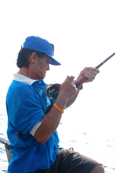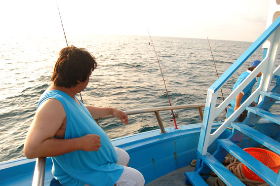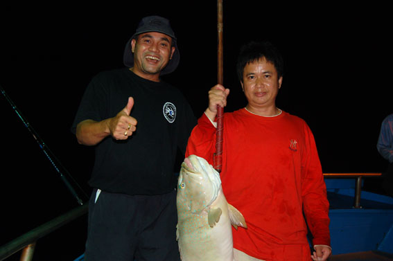 นี่เลยครับ ท่าอัดปลาของน้าต้นหลิว มันส์จริงๆครับ น้าต้นหลิววิ่งตั้งแต่กลางเรือมาอัดต่อที่หัวเรือ เพราะปลาวิ่งและดึงหนักมาก เพื่อนๆสมาชิกลุ้นช่วย และต่างทายกันว่าจะเป็นปลาอะไร
