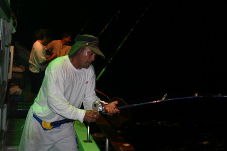 จากนี้ไปอีกหลายชั่วโมง กว่าจะถึงหมาย หน่วยผู้กล้านักล่าจากแดนสยาม ทยอยกันเข้าไปพักผ่อนในห้องนอนที่เปิดแอร์เย็นช่ำ คงเหลือ ผู้กล้าแดนตายไม่กี่คนที่ทรหดอดทน ไม่ยอมหลับยอมนอน หนึ่งในนั้นก็คือสหายต้นหลิวผู้หืดกระหาย “ประมาณ 3 โมง กว่า เราจะผ่านชายร่อง ที่นั้นจะมีโอกาสได้ซ้อมมือกันอีกครั้ง แต่จากนี้ไปพักเอาแรงไว้ก่อนดีกว่า” โย ชนบทบอก สมาชิกที่ถ่างตาเฝ้า สายTrolling ไม่ยอมพักยอมผ่อน แต่ก็ไร้ผล เขายังคงเป็นมนุษย์เหล็กไม่ยอมนอนอยู่ดี กระทั้งตะวันบ่ายแก่ๆ สมาชิกเริ่มทยอยกันตื่นนอน ด้วยความสดชื่น ร่างกายพร้อมที่จะผจญกับศึกใหญ่ที่รออยู่ข้างหน้าในอีกไม่นาน “อ่า.....ได้นอนสักตื่น ค่อยยังชั่วหน่อย นี่มันกี่โมงแล้วนี่” โยชนบท ตื่นขึ้นมาก็เอ่ยปากถามนายเก๋ ผู้คุมเรือ ในขณะที่มือขวาคว้าขวดน้ำ แล้วเทน้ำลงบนฝ่ามือลูบหน้าลูบตาเรียกความสดชื่น ให้คืนกลับสู่ร่างกาย “จะ 4 โมงเย็นแล้วพี่โย เย็นนี้จะกินอะไรกันดี ครับ” นายเก๋ กล่าวตอบ “อื่ม... นี่ก็กำลังจะเข้า เขตร่องน้ำแล้วอ่ะ ดิ บ๊ะ งั้นต้องรีบไปลงสาย Trolling สะหน่อย เผื่อจะเจอตัว แบบคราวที่แล้ว” โย ชนบท กล่าวจบ ก็งัดเอาเหยื่อ BONITA สีส้มหลังดำ ในนาม ‘มะระกอ’ ขึ้นมาเข้าสายหน้า 150 ปอนด์ “เอาหม้อหุงข้าวของน้าบรรจง นี่ละวะ น้าเล็กเตรียมตัวโดนของใหญ่ไว้ได้เลย เหยื่อตัวนี้ลีลาส่ายก้นมันออดอ้อนดีนัก ปลาเห็นต้องผวาเข้ามางาบทุกที” โย ชนบทกล่าว ในขณะที่กำลังปล่อยสายออกจากรอกตัวยักษ์ แล้วก็จริงอย่างที่คาดไว้ เมื่อเรือแล่นผ่าน สันดอน ที่ระดับน้ำลึกประมาณ 300 กว่าเมตร ปลายคันก็โน้มลงตามแรงกระชาก ก่อนที่ หม้อหุงข้าว จะคำรามเสียงดังกึกก้องสนั่นลำเรือ ‘กร๊อดดดด’ แต่แล้วเหมือนฟ้ากั่นแกล้ง ตดพอให้หมาดีใจเล่น