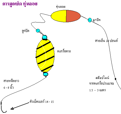 2. การผสมเหยื่อตกทุ่น ควรผสมกะทิ ให้เหยื่อค่อนข้างเหนียว เพื่อไม่ให้แตกตัวเร็วเกินไป แต่อย่าให้เหนียวมากจนเหยื่อไม่แตกตัวเลย เรื่อง ความเหนียวของเหยื่อ ต้องใช้ประสบการณ์ของผู้ตกเอง แต่ระลึกเสมอว่า เมื่อเหยื่อลอยอยู่ จะต้องแตกตัวออกมาอย่างช้าๆ