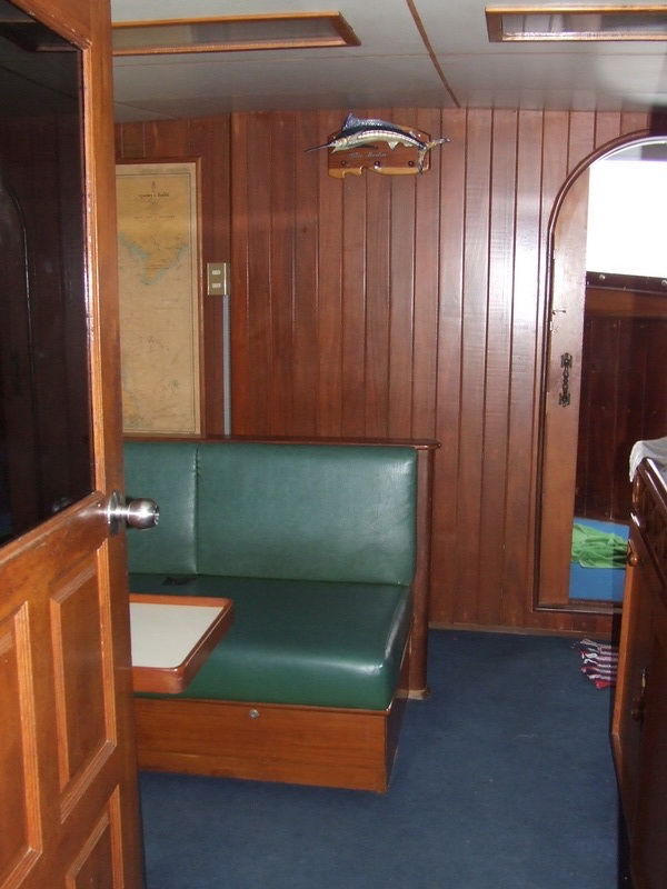 มองจากท้ายเรืออีกมุมที่เห็นช่องข้างถังน้ำแข็งคือทางเข้าห้องเครื่อง ส่วนช่องถัดจากห้องเครื่องไปจะเป็นทางเข้าด้านซ้ายเป็นห้องน้ำ-ด้านขวาจะเป็นที่ทำอาหาร-เดินผ่านห้องอาหารไปจะเป็นห้องรับแขก-ถัดไปจะเป็นทางลงไปห้องนอนที่อยู่ใต้ท้องเรือแต่ถ้าไม่ลงจะเดินต่อมาก็จะเข้าไปยังห้องกัปตัน ซึ่งออกแบบมาแบ่งสัดส่วนไว้อย่างลงตัวจริงๆ