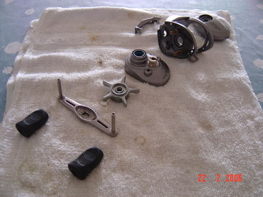 เอาละที่นี้ก็มาดูชิ้นส่วนต่างๆ ที่คิดว่าจะทำสี และสามารถทำสีได้ดีกว่า (คงไม่มีใครทะลึ่งจะไปทำสีเฟือง เกียร์ ลูกปืนหลอกนะครับ) ของผมที่จะนำมาทำสีก็มี ที่จับ (Knob), แขนหมุน (Handle), ที่ปรับเบรค, ฝาปิดข้ายซ้าย, ฝาปิดด้านขวา, และตัวเฟรมรอกครับ