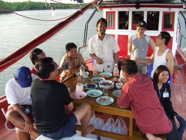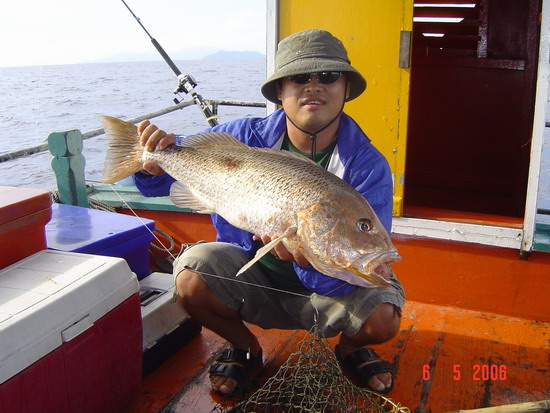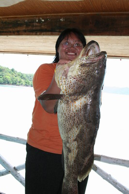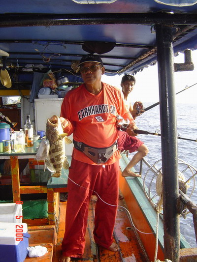 อีกภาพบนเรือไต๋โก๊ะ....คุณเสือ ศรีราชากำลังอัดลูกหมู size 11 kg ถ้าตัวโตอีกนิดเดียว อาจคว้าทั้ง 2 รางวัล มีหวังไต๋โก๊ะได้โม้ข้ามปีอีกครั้ง หลังจากปีที่แล้วก็ชนะเลิศด้วยปลาเก๋าติดอวนมา