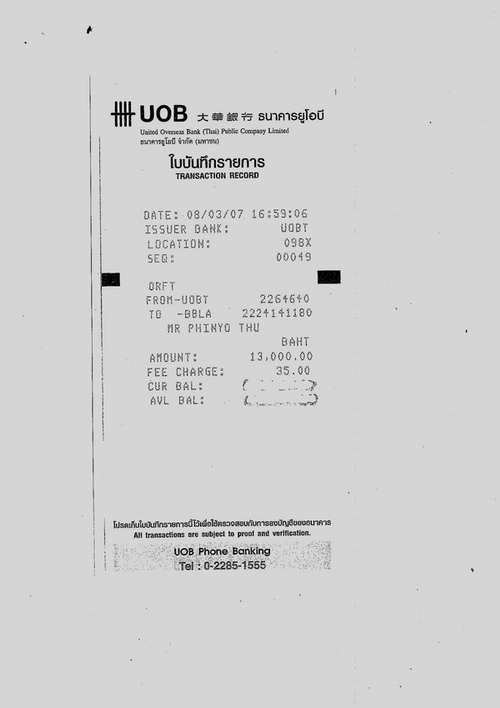 คุณโย..ผมโอนเงินให้แล้วครับ 8,500 บาท 12/03/50 เวลา 14.01 สถานที่ A05285 KTBA (กรุงไทย ATM)