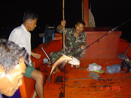 ดีนะที่หมายสุดท้ายปลาที่มาฉวยเบ็ดของนายเดือนเป็นปลากระเบน size เกือบ 20 kg เล่นเอาไต๋อ้วนยืนลุ้นตัวโก่ง เหงื่อแตกพลั๊กๆอยู่กาบเรือเกือบชั่วโมง (กลัวเป็นปลาโฉมงามหรือปลาช่อนทะเลตัวใหญ่เพราะวิ่งไม่ยอมหยุด) ไม่งั้นไต๋อ้วนโดนแขกอุ้มโยนลงทะเลแน่ๆ