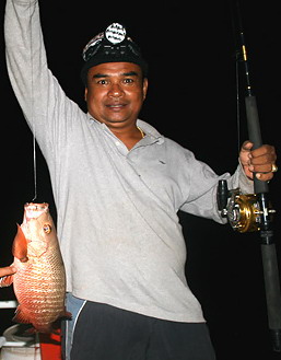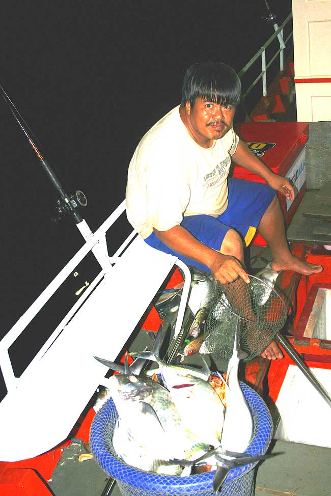 ถึงหมายโสกเหยื่อโกอู้ดทำการทันทีก่อนออกตกหน้าดินที่กระรังหลามจนค่ำเลยถอนสมอไปนอนเกาะรอกที่อ่าวกล้วยเถื่อนด้านหลังเกาะรอกหลังท่านข้าวเสร็จและลงเหยื่อและกัปตันฉ้องทำการปั่นไฟล่อปลาอยู่พักใหญ่ทุกคนทำท่านอนเหลือแต่ผู้พันนูญคนเดียวที่นั้งลงเหยื่อปลาทุแห่ลแล้วสี่งที่ไมคาดฝันก็เกิดขึ้นกระมงพร้าวไซล้ 4-5 โลก็เข้ามาฉวยเหยื่อลงเหยื่อลงอีกกินอีกเลยปลุกทีมงานที่ไปด้วยกัน โกอู้ด กัปตันฉ้องลงเหยื่อปลาเป็นทันที่แล้วทุกอย่างในเรือก็จุนลมุนวุนวายทันทีสักประมาณชัวโมงเศษเหยื่อปลาเป็นก็หมดลงครับทุกอย่างก็เงียบลงเหมือนกันครับได้ปลากระมงพร้าวมาประมาณ 30 ตัวเห็นจะได้ครับ