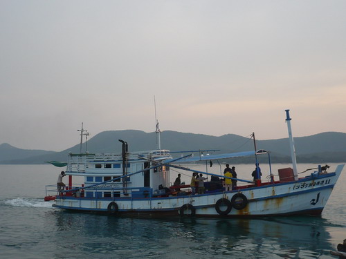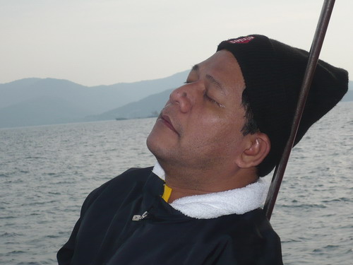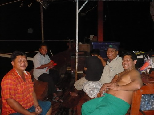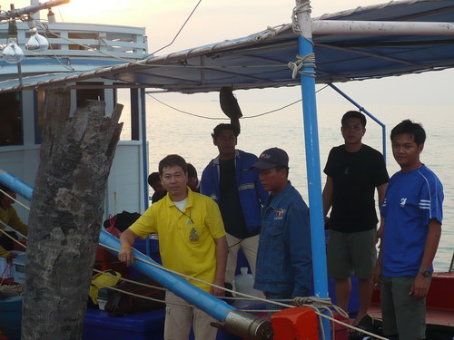 แต่ก่อนที่เรือจะออกได้ยินไต๋หนึ่ง..ถามว่าไม่ซื้อของกินลงเรือเลยหรือ ของสดและผักมีหรือเปล่า ไม่มีครับ อย่างงั้นไข่หรือมาม่าล่ะ ก็ไม่มีครับสีหน้าไต๋หนึ่ง..งงมีแต่เสียงตอบมาว่าพวกผมพร้อมใจกันจะต้องตกเอาปลามาทำอาหารให้ได้ถ้าไม่ได้ก็อด ผมได้ยินแล้วนึกย้อนไปถึงสมัยพระเจ้าตากสั่งทุบหม้อข้าวก่อนเข้าตีกรุงธนเลย แต่ไต๋หนึ่ง..ก็ยังมีคำถามอีกว่าแล้วเย็นนี้จะกินอะไรกันมีแต่ข้าวสาร พวกคุณอดได้ผมกับจุมโพ่ก็อดได้เหมือนกัน โอ้พระเจ้า..ใจช่างเด็ดเดี่ยวจริงๆน่านับถือ