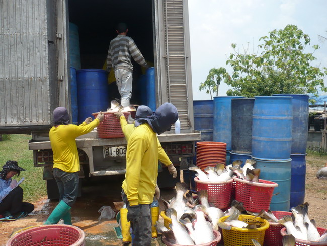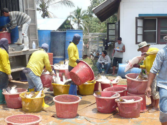 ระหว่างที่รถห้องเย็นยังไม่มาเมื่อปลาล้างแล้วต้องรีบดองน้ำแข้งทันทีเพื่อรักษาความสดของปลา........