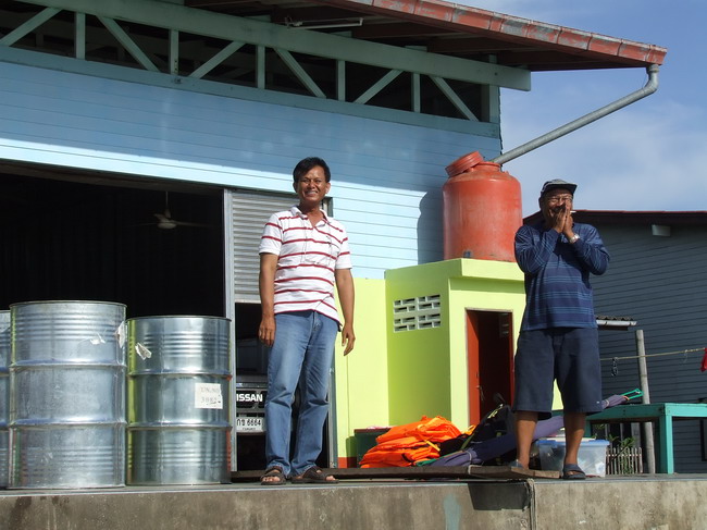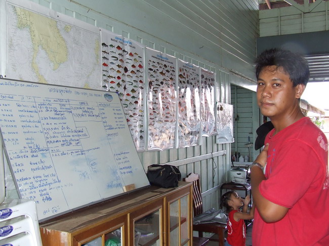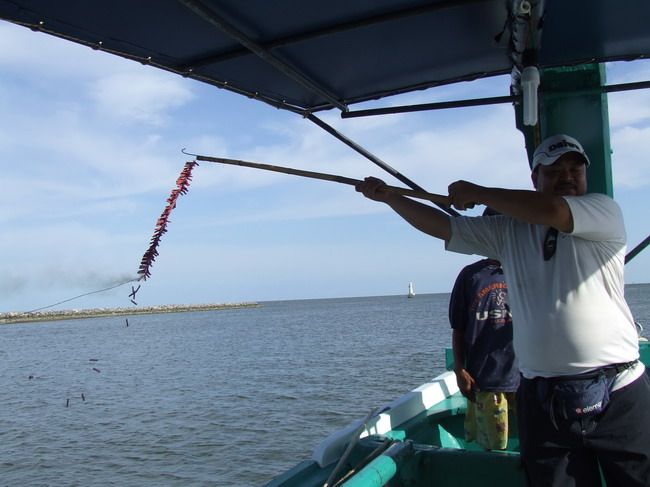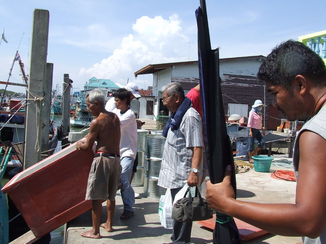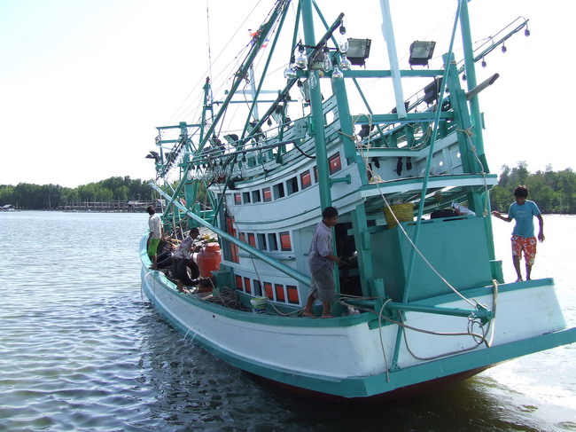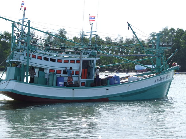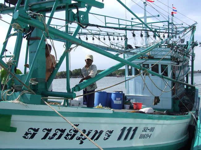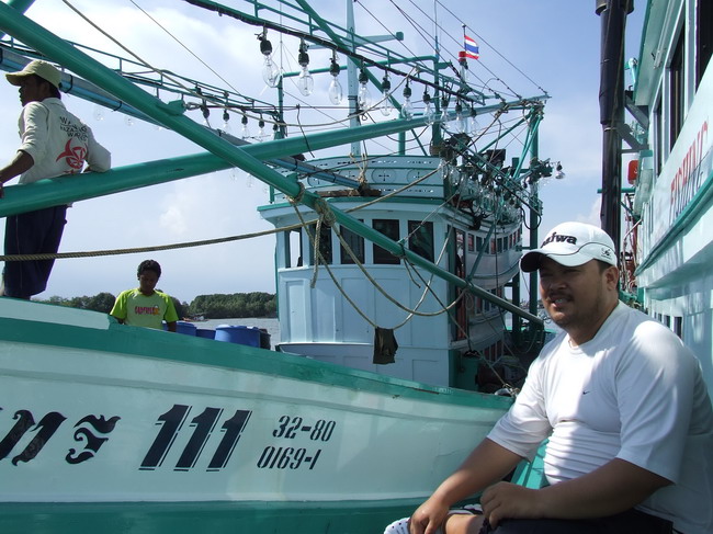 เรือลำนี้แหละครับที่จะไปช่วยปั่นหมึกช่วยเรา เพิ่งลงจากคานมาแบบสียังไม่ค่อยจะแห้งเลย เห็นผู้ใหญ่จื้อกำลังไหว้แม่ย่านางพอดี