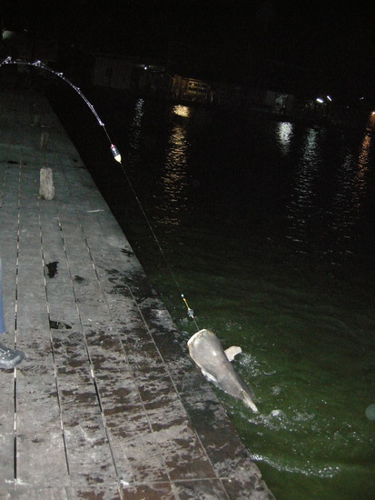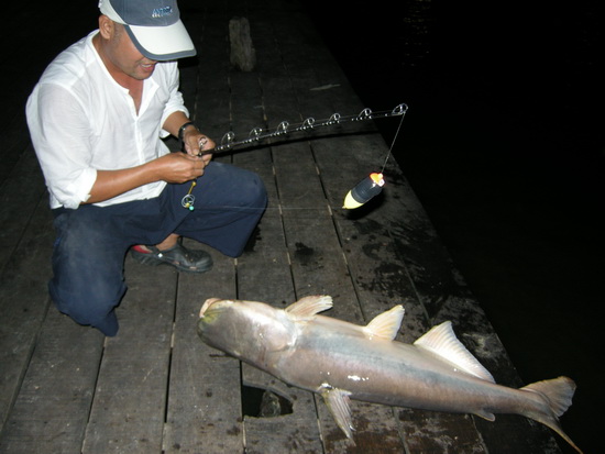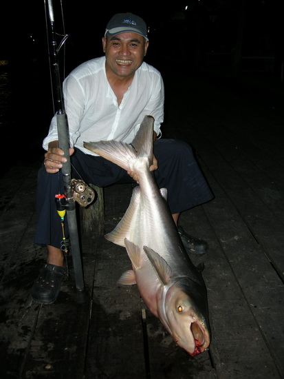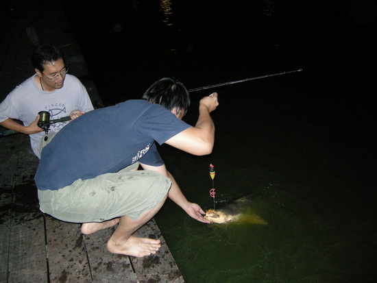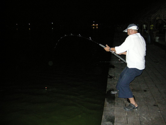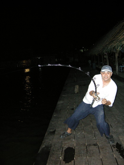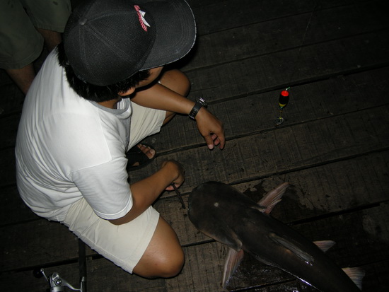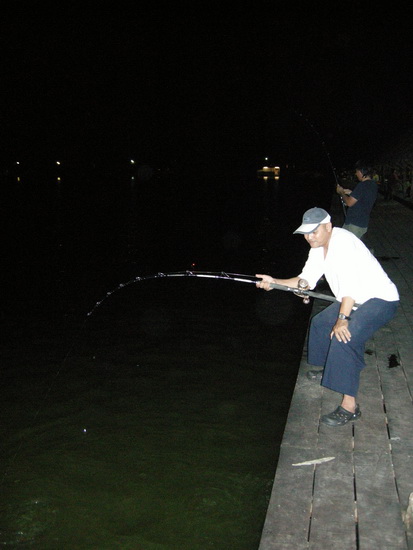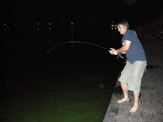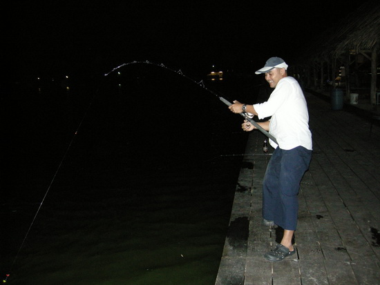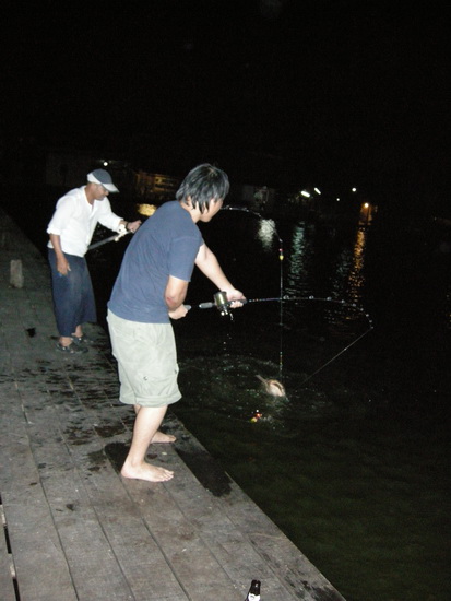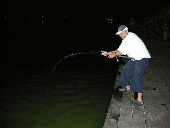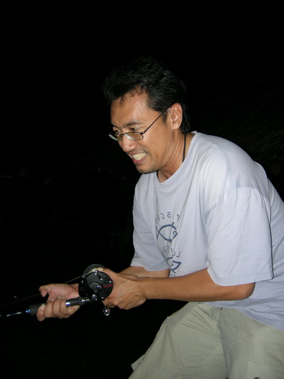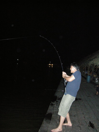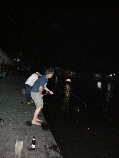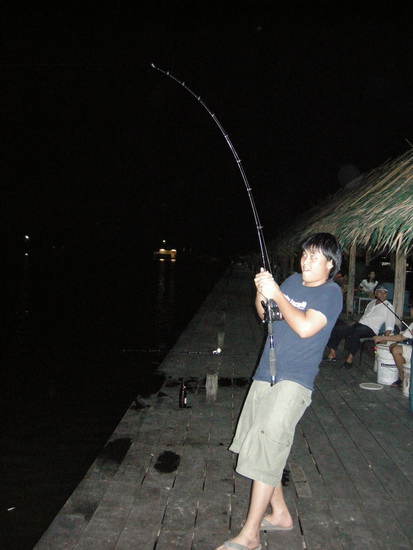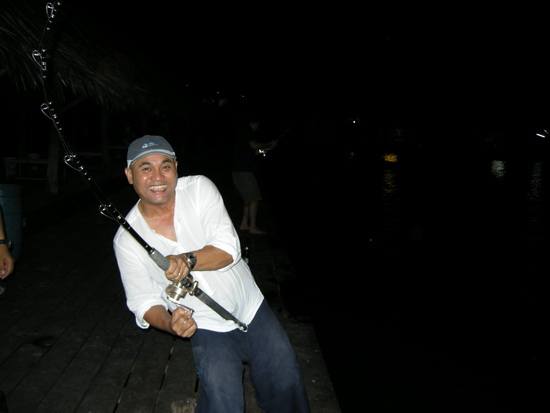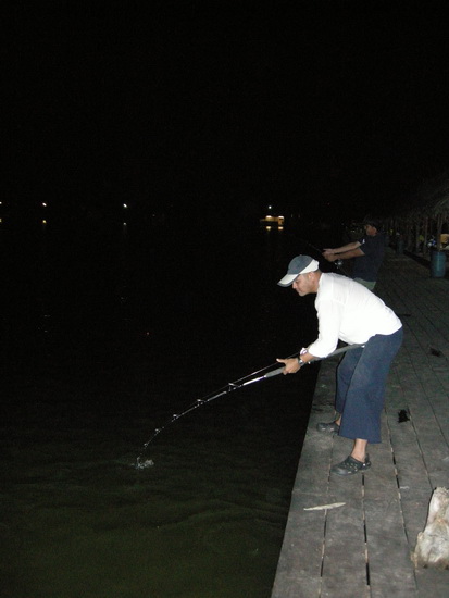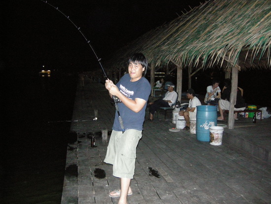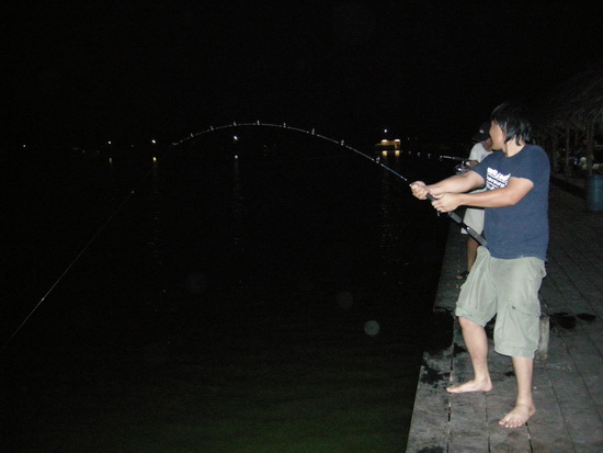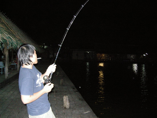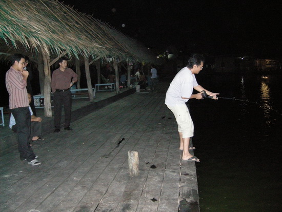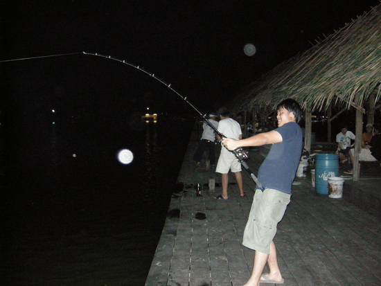 เริ่มลงเบ็ดเมื่อราวสามทุ่มกว่า ปลาไม่ยอมเข้ามากินเบ็ดเลย วันนี้คณะเรายังคงเลือกทำเลเดิมคือซุ้ม 9-10 เป็นฐานที่มั่น เหยื่อที่ใช้ยังคงเหมือนเดิมคือ รำ ที่จำหน่ายโดยบานสำรึง ผสมกับน้ำในบ่อ ปั้นตีกันจนหมดไปหนึ่งถังก็ยังไม่กิน อาจมาจากการผสมเหยื่อไม่ได้ที่เพราะน้าต้นหลิวคนผสมเหยื่อไม่ยอมมาเสียที่ มัวแต่ไปเมา y กับลูกค้าต่างชาติ