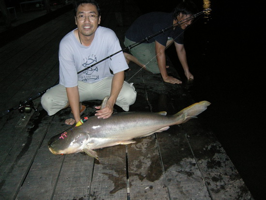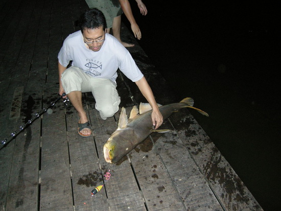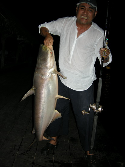 ได้ตัวแรกแล้ว น้าต้นหลิวก็มาถึง แล้วก็แสดงความเป็นเทพปลาบึกทันที่ เมื่อลงเหยื่อไม้แรกรอกตัวเก่งก็ร้องลั่นทันที่ น้าต้นหลิวเดินอย่างสง่าเข้าหาคันคู่ใจเอื่อมมือประคองคันขึ้นมาอย่างช้าๆ(เพราะเมา y ) แล้วตวัดเบ็ดอย่างหนักแน่นแต่ไม่รุนแรง จนคันโกงงอราวคันธนู