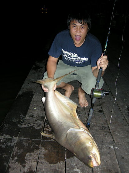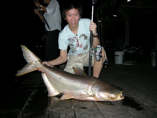 แม้น้องเนมจะอัดปลาออกจากใต้แพและทำให้น้าต้นหลิวสะเทือนขวัญได้ในช่วงแรก แต่ความเป็นเทพปลาบึกย่อมไม่มีคำว่ายอมแพ้โดยง่าย แกคว้าคันที่วางราบกับพื้นแพขึ้นมาตวัดอย่างแรงไปหลายครั้งจนคมเบ็ดฝังแน่นจนมั่นใจว่ามันไม่อาจหลุดรอดจากคมตะขอได้แล้วก็มายืนเคียงข้างน้องเนมถือคันบรรจงอัดอย่างนุ่มนวล (ดูจากรูปด้านบนจะเห็นเทพปลาบึกถือคันอย่างยิ้มย่อง)