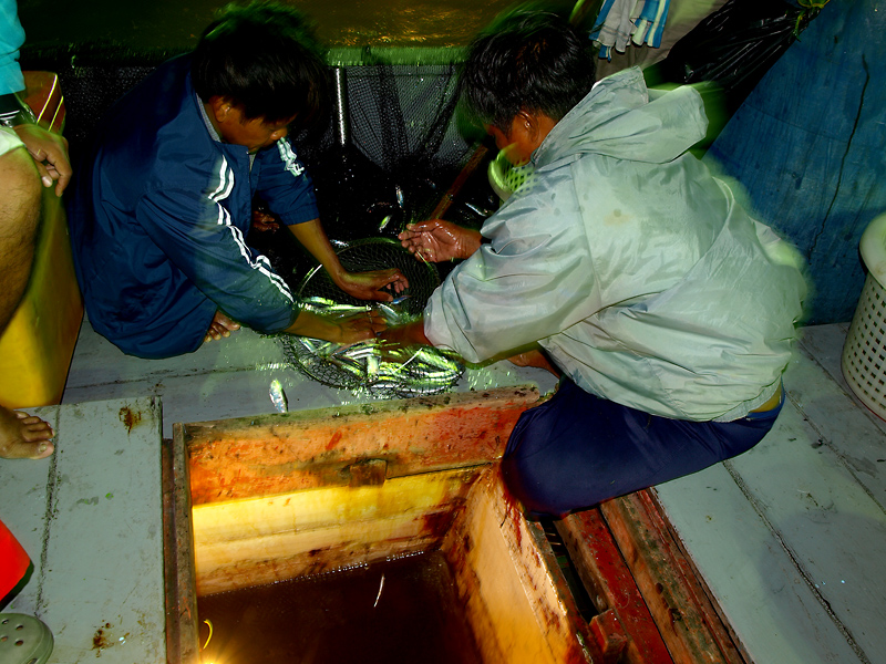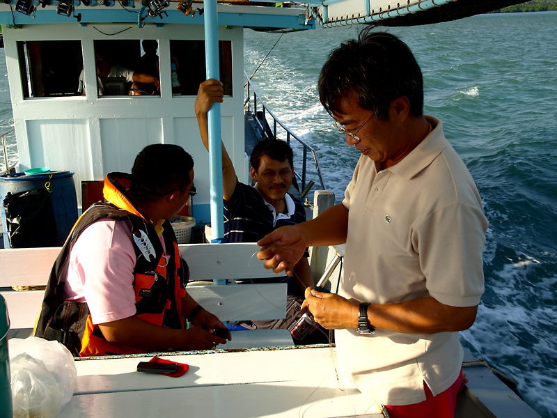หลังจากนั้นเราครอบหมึกกัน 3 ครั้งได้หมีกมาร่วมพันตัวแต่เจอคลื่นลมกระหน่ำตลอดวัน จนไม่สามารถตกปลาได้เลย หัวหน้าทีมเรียกประชุมด่วนเอาอย่างไรดี สรุปกลับเข้าฝั่งดีกว่ายอมแล้ว
