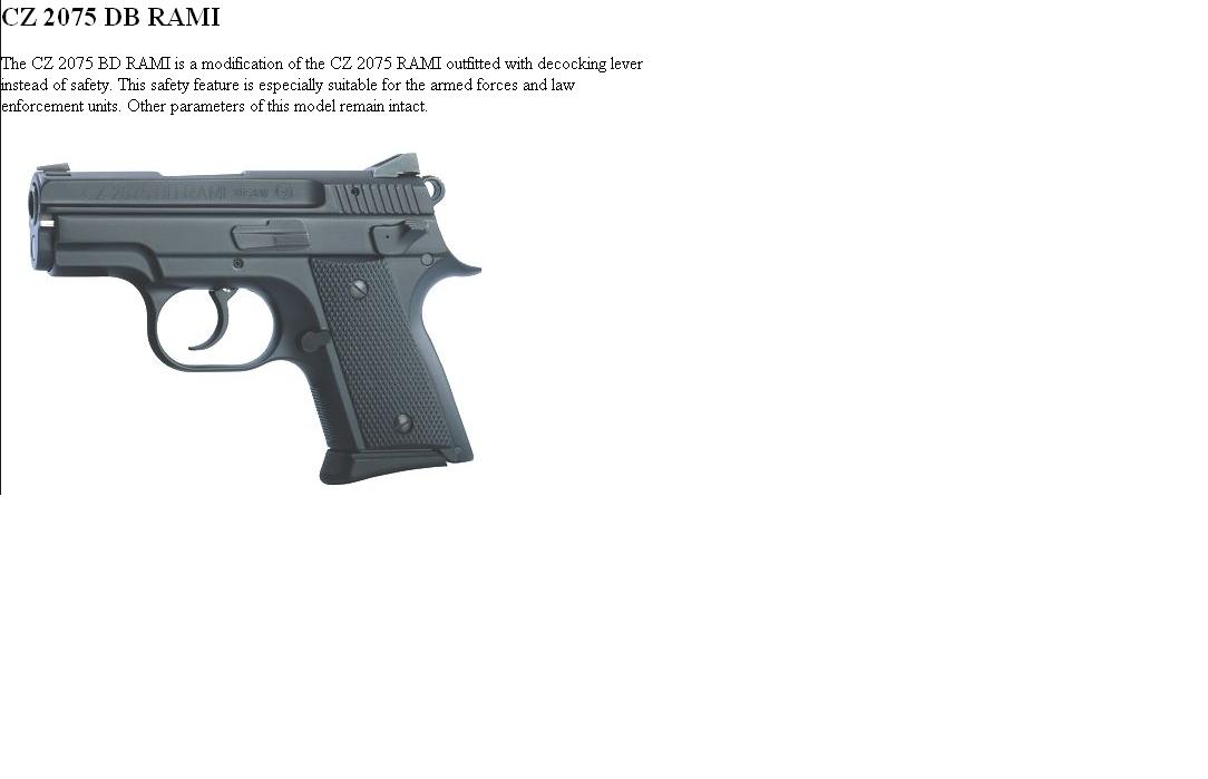 มาใหม่ แคตตาล็อกปี 2008 มีทั้ง 2075 รามี อัลลอยด์แบบเดิม ( 9 มม.และ .40 ) และ แบบใหม่ CZ 2075 BD rami ( 9 มม. ) เปลี่ยนจากเซฟ เป็น คันลดนก ตามรุ่นพี่ CZ 75 D compact มันก็ดีไปอีกแบบนะครับ ไม่ต้องระทึกใจ เวลาขึ้นลำเลื่อนแล้วลดนก ตอนรอใช้ ส่วนเจ้า CZ RAMI 2075 P ในแคตตาล็อก เค้าว่าขายดิบขายดีกัน แต่บ้านเราเห็นมีปัญหากันหลายตัว ไม่รู้ยังไงครับ