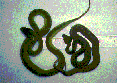 วันนี้วันศุกร์ 10 กรกฏา ตอนเวลา 14.20 ช่วงบ่าย ผมนั่งดูละคร โทรทัศน์ อยู่ดีๆ ก็ได้ยินเสียงก็อกๆแกร๊ก สงสัยมาจาก ทางห้องเก็บของ เลยไปดูเห็นงูเลื้อยขึ้นไปข้างบนห้อง เลยวิ่งหนีออกมาทางหลังบ้าน แล้วปิดประตูมุ้งลวด กลัวถูกงูกัดเลยหนีเอาชีวิตรอดก่อน ตอนนั้นอยู่บ้านคนเดียว เฝ้าบ้านอยู่ครับ แล้วก็วิ่งออกไปเรียกบ้านข้างๆให้มาช่วยตีงู ปรกฏว่าเขาก็กลัวงูเหมือนกัน เลยไม่ยอมมา ลักษณะงูที่พบ เป็นสีน้ำตาลเข้มๆและออกเหลืองเขียวๆ เลื้อยเร็วๆ เลยคิดว่าน่ะจะเป็นงูเขียวหางไหม้ หลังจากนั้นรอประมาณ 10 นาทีเจอคนที่เค้าทำงาน เลิกงานตอนบ่าย พี่แกใจดี กลัมมาเลยบอกให้พี่แกช่วย ตีงูให้หน่อย พี่เข้าก็เข้าไปดู และผมก็เข้าไปรื้อห้องเก็บของดูประมาณ 20 นาที แต่ไม่พบตัวงูแต่อย่างใด เลยนำมาเล่าให้ฟัง เป็นประสบการณ์ชีวิตที่เจองงูเข้าบ้านครับ เล็กแต่พิษร้ายแรงนะครับ