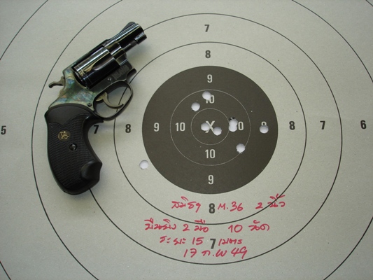 เทารัสเปลี่ยนด้ามแล้วครับ ดูดีขึ้นและไม่หลวมเหมือนด้ามเดิมที่แถมมา (ขอบใจน้องชายที่ส่งมาให้) แต่มีคำถามจากท่านผู้รู้เพิ่มเดิม ดังนี้ .....1/เปลี่ยนด้ามสั้นลงจะมีผลกับความแม่นยำของปืนหรือไม่... 2/สปริงเชียของสมิทใช้กับเทารัสได้หรือไม่ .... 3/ปืนขนาดลำกล้อง 2 นิ้ว ควรฝึกความแม่นยำที่ระยะกี่เมตรตามมาตรฐานปืนขนาดนี้..../ขอบคุณครับ...