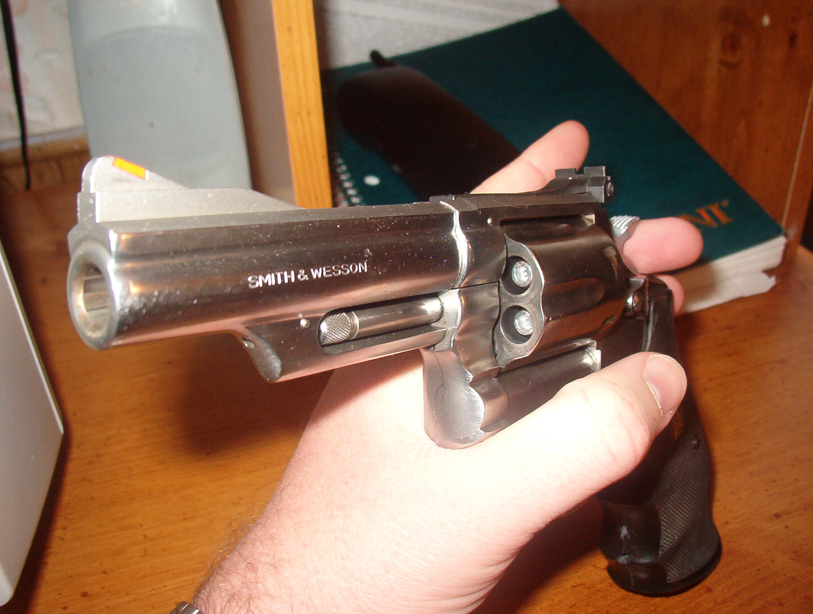 4.เมื่อปิดโม่รอยต่อบานพับโม่ควรเรียบสนิท(ตรงง่ามมือตามภาพน่ะ) แต่ถ้าไม่เรียบบ้างนิดหน่อยก็พอยอมรับได้ เพราะผมเห็นปืนสมัยใหม่จุดนี้หาเรียบได้ยากแล้ว ไม่เหมือนปืนสมัยก่อน