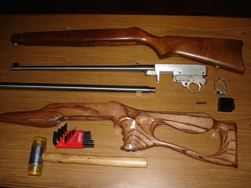 ทีว่าง่ายหลังจากได้ลำกล้องมาแล้ว เพราะปืน Ruger 10/22 เราสามารถเปลี่ยนลำกล้องได้เองโดยไม่ต้องพึ่งช่างที่ไหน มีเครื่องมือพื้นๆนิดหน่อยก็ทำเองที่บ้านได้แล้ว ส่วนพานท้ายที่ต้องเปลี่ยนจากเดิมเพราะเส้นผ่าศูนย์กลางลำกล้องมันโตขึ้น พอจะหาซื้อได้ที่ร้าน กัน แอนด์ กาย(ก็ร้านที่เคยมีลำกล้องแอบขายนั่นแหละ) ร้าน ม.ฮะกีมี หรือ ร้านปืนอำภาที่ข้างคลอง รวมทั้งอาจสั่งทำพานท้ายใหม่ได้ที่ร้านซ่อมปืนข้างคลองนั่นแหละครับ