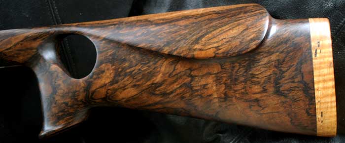 เรื่องไม้นี่ทั่วโลกยอมรับแล้วว่า พานท้ายปืนที่ทำจากไม้ Walnut เป็นสิ่งที่ดีที่สุด เพราะมีลายไม้และสีสันที่สวยงามเนื้อไม้ไม่แข็งเกินไปทำกัดเซาะไสแต่งได้ง่ายแต่มีความทนทาน น้ำหนักเบา เรื่องลายไม้นี่ก็แล้วแต่ตำแหน่งของไม้ด้วยนะครับ เช่นไม้ส่วนที่ได้มาจากง่ามไม้ที่แยกออกมาจากกันและมีอายุมากๆ(60-70 ปีขึ้นไป)จะมีลายพริ้วเหมือนขนนก ความนิยมสูงทำให้มีราคาแพงกว่าส่วนอื่นๆใช้กับปืนเกรดสูงๆเท่านั้น เพื่อนผมเคยซื้อที่สเปนเฉพาะท่อนไม้ยังไม่ทำออกมาเป็นพานท้ายปืนราคาหลักหมื่นครับ