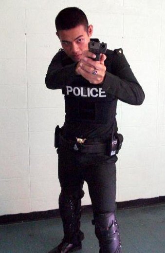 พ่อหนุ่มที่ยืนข้างหลังหมู่แม็กนั่นน่ะ ยืนอย่างท้าทายอวดปืนประจำตัวอย่างไม่มีความยำเกรงเจ้าหน้าที่บ้านเมืองอย่างหมู่แม็กเลยนะครับ...