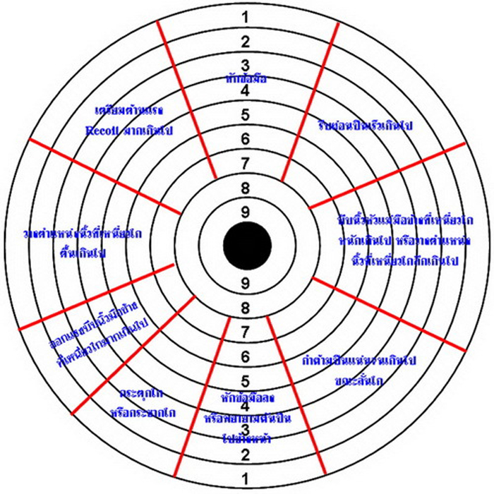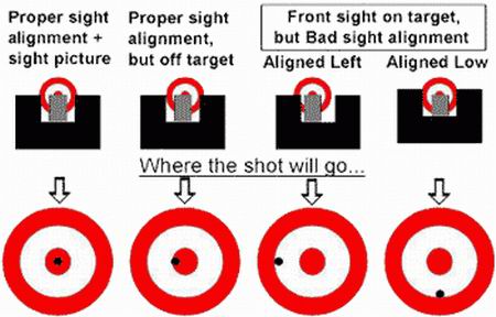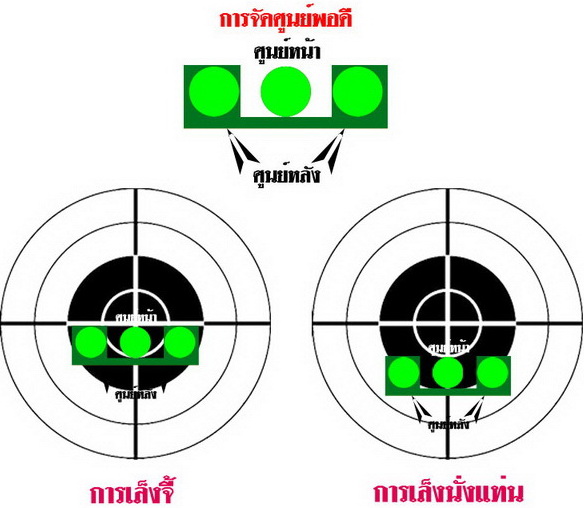ที่ว่าเล็งไม่เป็นนี่มันไม่เป็นยังไง ไม่รู้จะเอาศูนย์หน้าไปวางไว้ตรงไหนของศูนย์หลังแบบนี้หรือเปล่า? วิธีจัดศูนย์ตามรูปนี้จะแสดงให้เห็นว่าถ้าจัดศูนย์/หลังแบบไหน กระสุนจะไปโดนเป้าตรงไหน ลองเอาไปทำดู