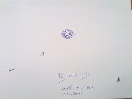 ทดลองยิงมาแล้วครับ ผลออกมาคือ ห้านัดอยู่ในกรอบกระดาษ เอ4 3 นัด หายไปไหนไม่รู้ 2 นัด (ตามรูป) / ส่วนตัวรู้สึก 1.ว่าปืนจะมีแรงรีคอยมากพอควร 2.ไกแข็งกว่ากล็อก 3.คนยิงไม่มีสมาธิ /จะพยามยามปรับปรุงขอคำแนะนำด้วยครับ