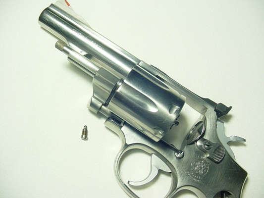 ดึงแกนโม่และตัวลูกโม่ออกไปทางด้านปากกระบอกปืน ในภาพเป็นปืนสมิธฯ M.66 การถอดรุ่นอื่นของปืนลูกโม่สมิธฯก็เหมือนกันหมดครับ