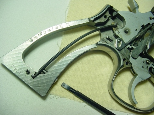 ที่ไขควงชี้เป็นสกรูตั้งไก ขันเข้าไกจะหนักขึ้นนกสับจะตีแรง ขันออกไกเบาลงนกสับตีค่อย