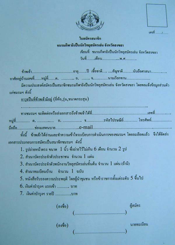 หน้าตาใบสมัครครับ...ถ้าพิมพ์ตาม(ลอก)...ชมรมฯ จะประทับตราให้ทีหลังก็ได้ครับ...หรือถ้าจะเอาไฟล์เวิร์ด ก็แจ้งความประสงค์มาได้ที่ hamandgun@yahoo.com แล้วเราจะส่งไปให้ ครับ
