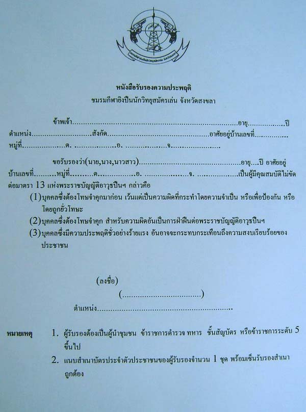 หน้าตาใบรับรองความประพฤติ ครับ...ถ้าพิมพ์ตาม(ลอก)...ชมรมฯ จะประทับตราให้ทีหลังก็ได้ครับ...หรือถ้าจะเอาไฟล์เวิร์ด ก็แจ้งความประสงค์มาได้ที่ hamandgun@yahoo.com แล้วเราจะส่งไปให้ ครับ