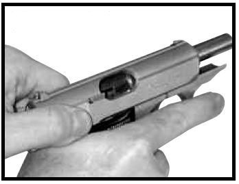 ๓. ง้างหน้าโกร่งไกลง แล้วคัดให้เกี่ยวค้างไว้ที่ร่อง
