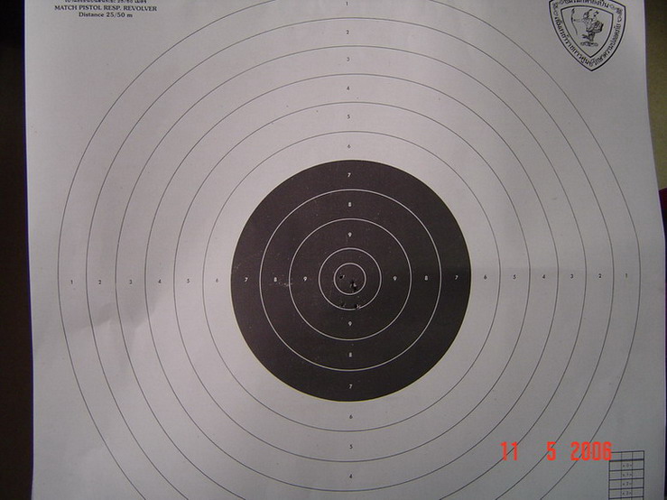 วันนี้ว่างๆลองเอาไปลองยิงดูครับ เจ้าตัว 452 STD 18K นั่นแหละครับ ติดกล้องบุชแนล 3-9 X 40 ราคา 1700 บาท นั่งยิงพาดศอกธรรมดาไม่มีอุปกรณ์ระยะ 50 เมตร กระสุน S&B STD 5 นัด ครับ กลุ่มผมว่าปืนดี แต่คนยิงคงต้องซ้อมมากๆหน่อยครับ