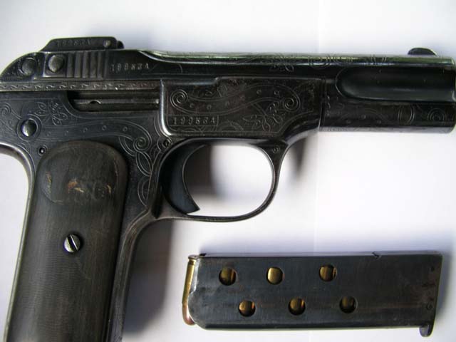คงเป็นปืนบราวนิ่งแน่ๆล่ะครับ ตราประทับชื่อย่อ FN ตรงด้ามหลุดหายไป น่าเสียดายเนอะ แต่สภาพปืนยังดูดี แถมเป็นรุ่นพิเศษแกะลายซะด้วย เยี่ยมจริงๆ