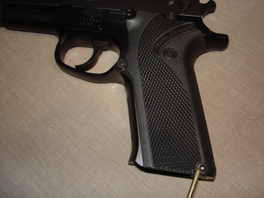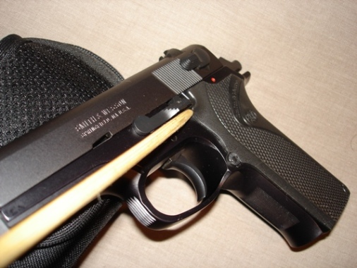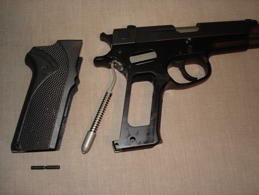 มาดูขั้นตอนการเปลี่ยนสปริงนกสับของสมิธฯ 915 นะครับ น่าจะคล้ายๆกับของบาเร็ตต้า ถ้าไม่เหมือนก็ขออภัยด้วยครับ ตอนแรกจะถอดแก้มประกับด้าม ต้องตอกหมุดที่ยึดตรงส้นด้ามออกก่อน
