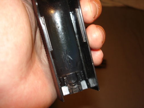 ตอนใส่กลับ ให้เอาฝาครอบสปริงนกสับเสียบยึดไว้กับเบ้าที่อยู่ตรงโคนแก้มประกับด้าม และง้างขอบแก้มประกับด้าม ให้สลักยึดอ้าออกก่อนดันแก้มประกับเข้าด้าม ไม่งั้นสลักยึดอาจหักได้เพราะเป็นพลาสติกแข็ง