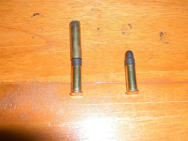 ผมเอาปลอกกระสุน Magnum ที่ยิงแล้วมาตัดชนวนออก แล้วเอาลูก .22 LF มาเสียบเข้าไป เวลายิงต้องยัดทีละนัดครับ พอยิงแล้วถ้าปลอกกระสุนที่สวมไว้ไม่หลุดออกมาก็ต้องทำลวดตะขอไว้เกี่ยวออกครับ ดังรูปครับ