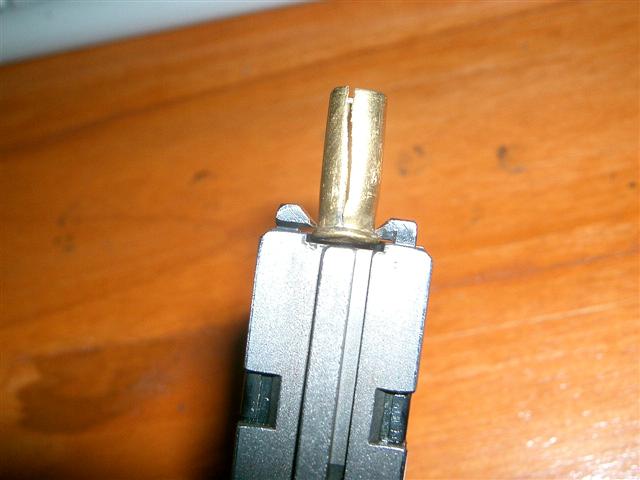 ตอนนี้ผมยัดใส่ปลอกกระสุนแมกนั่นเสริม ได้ประมาณ 400 นัด + เศษ ยิงโดนไม่ผ่าน แม๊กกาซีน บนส่วนแหลม เสียดสีกับ ชนวน ในจังหวะที่ดันลูกเลื่อนเข้าแล้วกดลง ตอนนี้รมดำขอรั้งปลอกกระสุนเริ่มเห็นรอยถลอกครับ แต่ยังเข้าไม่ถึงเนื้อเหล็กครับ