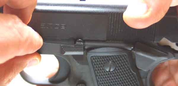 ....รั้งสไลด์มาทางด้านหลัง...ให้ร่องบากของสไลด์ตรงกับคันล็อคสไลด์....แล้วยกคันล็อคสไลด์ออกทางด้านข้าง