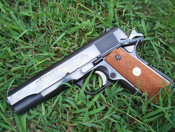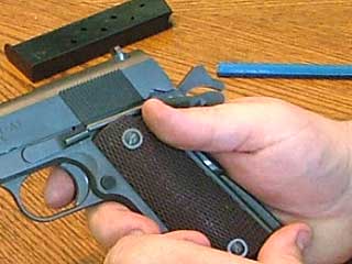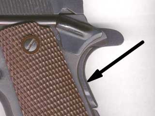 .... ภาพนี้...แสดงตำแหน่งของห้ามไกหลังอ่อน...หรือ grip safety ของปืนกึ่งอัตโนมัติ...ครับ....มันจะอยู่สันด้านหลังช่วงบนของด้ามจับ...เมื่อกดดูจะพบว่าสามารถยุบตัวได้...ครับ