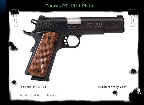 Taurus PT 1911 B.. เทารัส พีที 1911 บี ...ผู้ผลิต - เทารัส ฟอร์จัส.บราซิล ...ขนาด .45 เอซีพี...ปฏิบัติการ - ซิงเกิ้ล แอ็คชั่น. รีคอล์ยระบบ เบราว์นิ่งก์ - โค้ลท์...ระบบนิรภัย - ห้ามไก.ห้ามไกหลังอ่อน.ฮาล์ฟค็อค...บรรจุ - 8+1 นัด...ศูนย์ - ระบบต่อสู้...ลำกล้อง - 5 นิ้ว...ยาวตลอด - 8 1/2 นิ้ว...นํ้าหนัก - 1,060 กรัม...สไล้ด์ - เหล็ก รมดำ...โครงปืน - เหล็ก รมดำ ....เป็นปืนจากบราซิล ซึ่งก๊อปปี้แบบมาจาก เอ็ม 1911 มาทุกประการทั้งระบบปฏิบัติการและรูปร่างหน้าตา อุปกรณ์ที่ติดมากับปืนก็เป็นไปตามสูตรระดับของปืนคัสต้อม กันส์ เช่น ห้ามไกแทคติค่อล 2 ด้าน ห้ามไกหลังอ่อนแบบบีเวอร์เทล ปัดเงาคอรังเพลิง ขยายช่องคายปลอก แก้มประกบด้ามแบบพิเศษ ไกนํ้าหนักเบาเจาะโปร่ง พร้อมกับติดตั้งศูนย์ระบบต่อสู้ (Straight-8) สแตร้งค์-8 2จุด ศูนย์หน้าของไฮนี่ (Heinie) หงอนนกสับแบบคอมมานเดอร์เจาะโปร่ง หน้าตาดีทีเดียวครับ