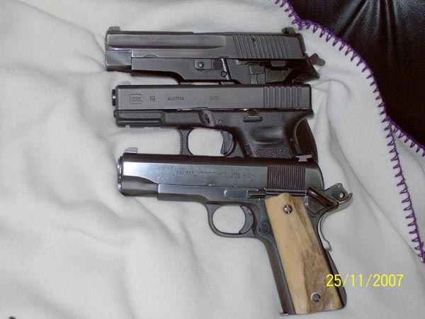 รูปนำมาวางเทียบ Sig ๒๒๖.. Glock ๑๙ และ Combat Commander มิติ ใกล้เคียงกัน ผิดแต่น้ำหนัก หนาบาง ครับ.