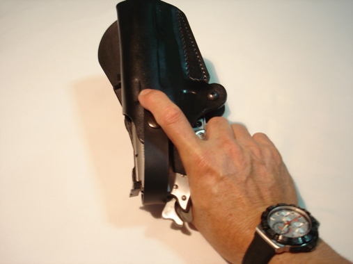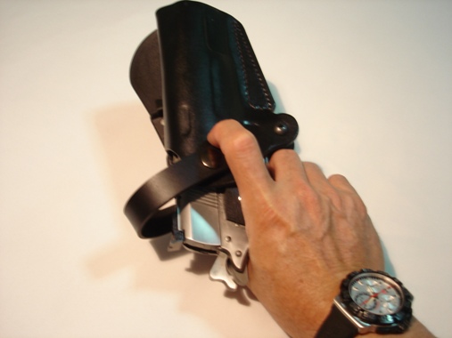 เวลาชักปืนออกจากซอง สามารถใช้นิ้วชี้เกี่ยวปลายสายรัดให้กระดกออกจากท้ายปืนก่อน โดยไม่ต้องปลดกระดุมสายรัด