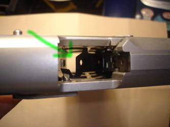 ๔. มองลงไปในช่องคายปลอก....สังเกตุตรงหน้าสไลด์(บริเวณที่เป็นท้ายของจานท้ายกระสุน)...จะเห็นตัวเตะปลอก....ให้กดตัวเตะปลอกให้พับจมลงไปในโครงปืน....ครับ