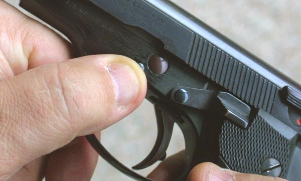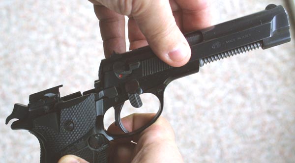 After checking the chamber, and removing the magazine, depress the locking pin on the left hand side of the frame.