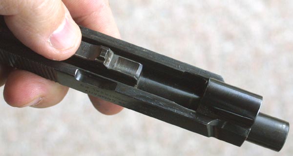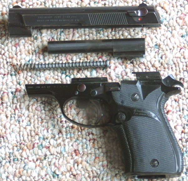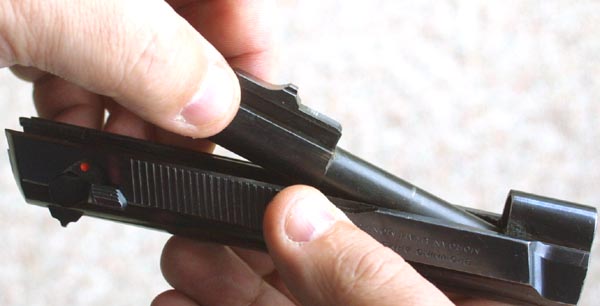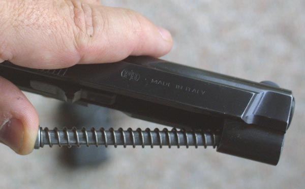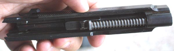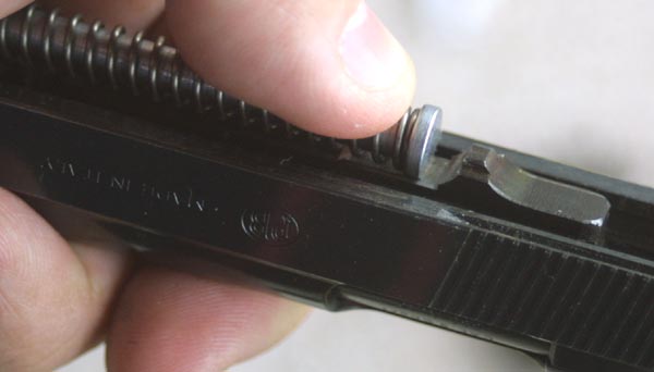 After cleaning, once the barrel is replaced within the slide, the recoil spring is replaced, and the end of the recoil spring guide rod is fitted into a detent on the barrel. The slide is then pushed back into the frame.