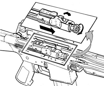 รูปแสดงการทำงานของระบบ Rotating bolt ของปืน M16 ในจังหวะ Unlocking
