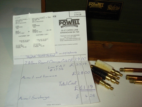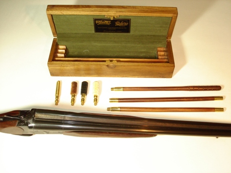 ปีใหม่มีคนส่งพัสดุไปรษณีย์มาให้ แกะออกมาเป็นกล่องไม้ลายสวย บรรจุอุปกรณ์ทำความสะอาดปืนลูกซองขนาด 28 เกจ มีก้านแส้ทำด้วยไม้ 3 ท่อน หัวแปรงขีด-ล้างลำกล้อง 4 หัว ดูหรูหรา ไฮคลาส ซะจริงๆ