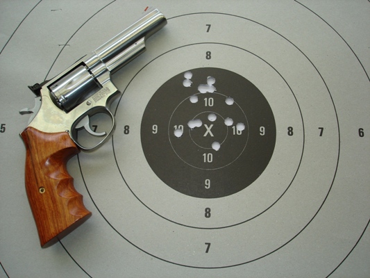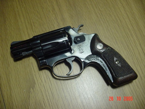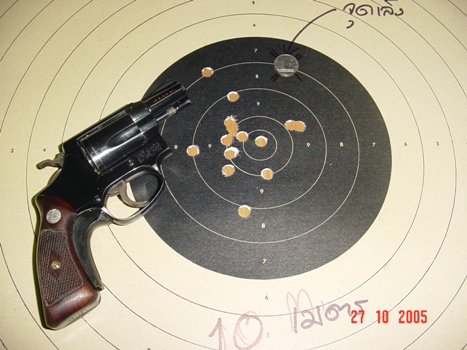 ยืนยิงสองมีท่าวีเวอร์(มั๊ง?) ระยะ 15 เมตร ปืนสมิธฯโมเดล 36 ลำกล้องสองนิ้ว กระสุนซ้อมของวินเชสเตอร์(ต้องเอาเปรียบหน่อย เล่นของนอก) เปลี่ยนด้ามเป็นด้ามยางของแพชเมียร์(เพื่อความได้เปรียบ..อีกแล้ว)