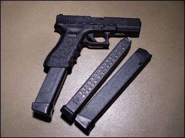 ***ในรูป ปืน Glock รุ่น G18 พร้อมแมกกาซีนยาวแบบ 33 นัด