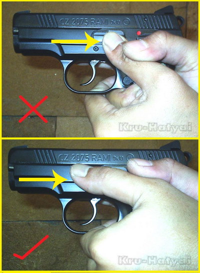 ซ้าย...ไปวางดันคันล็อคสไลด์ขึ้นในขณะยิง" พอสไลด์